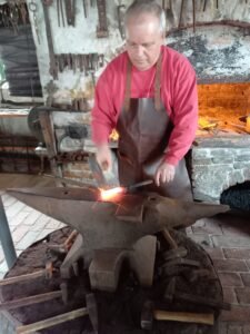 In der Schmiede angekommen begrüßte Hans Benkhauser, der zwar kein Schmied ist, aber diesem Hobby mit großer Begeisterung nachgeht, die Gäste. Als erstes wurde in der Esse ein Feuer entfacht, mit Hilfe eines Blasebalgs wurde die Steinkohle schnell zum Glühen gebracht. Der Hobbyschmid erklärte, wie man an der Farbe des zu schmiedenden Eisens den Wärmegrad erkennt. Bei 1000 bis 1200°C kann man Eisen gut bearbeiten, wird es aber heißer, verbrennt Eisen bei ca. 1300 °C.